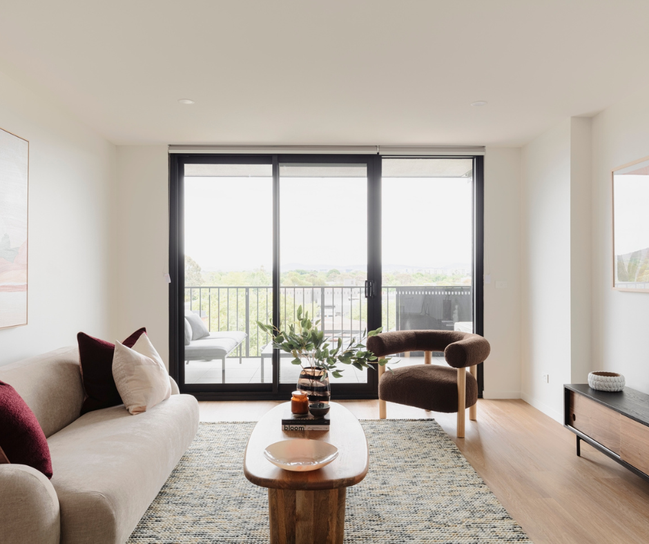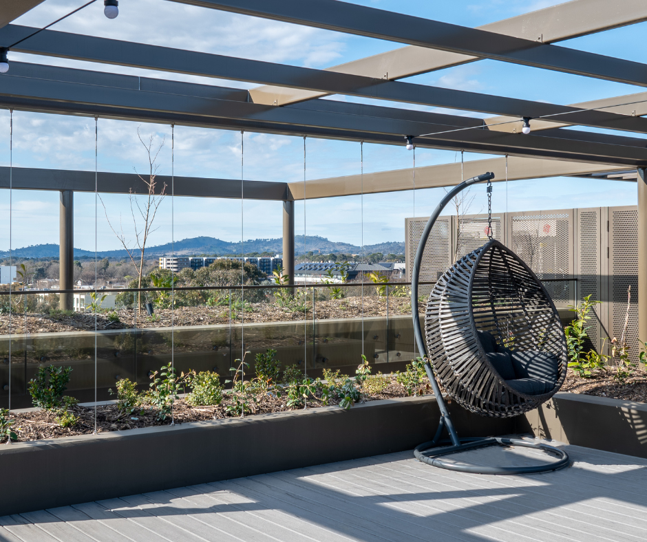 The building features exceptional external landscaped areas and gardens, designed by Redbox Design Group, while the rooftop communal areas offer panoramic views of Mt Ainslie, the Canberra CBD, and Black Mountain. The timeless homes within are light-filled, spacious and beautiful, setting a new standard for boutique apartment living in Canberra.