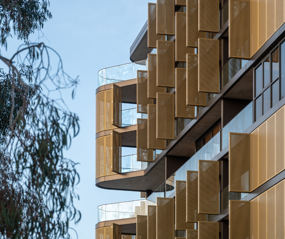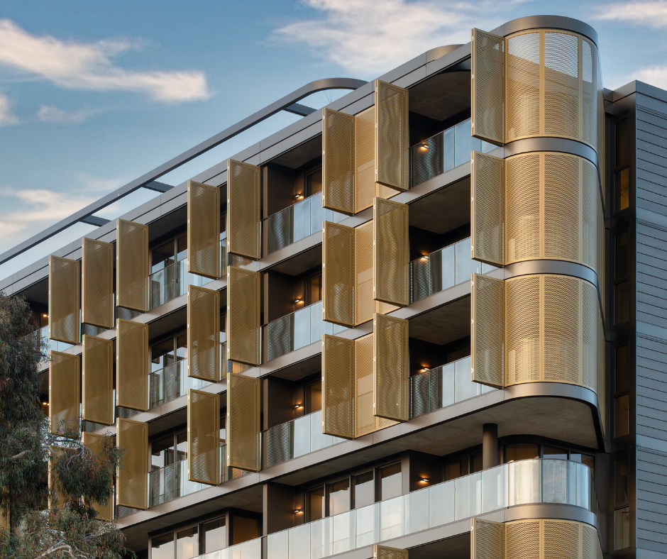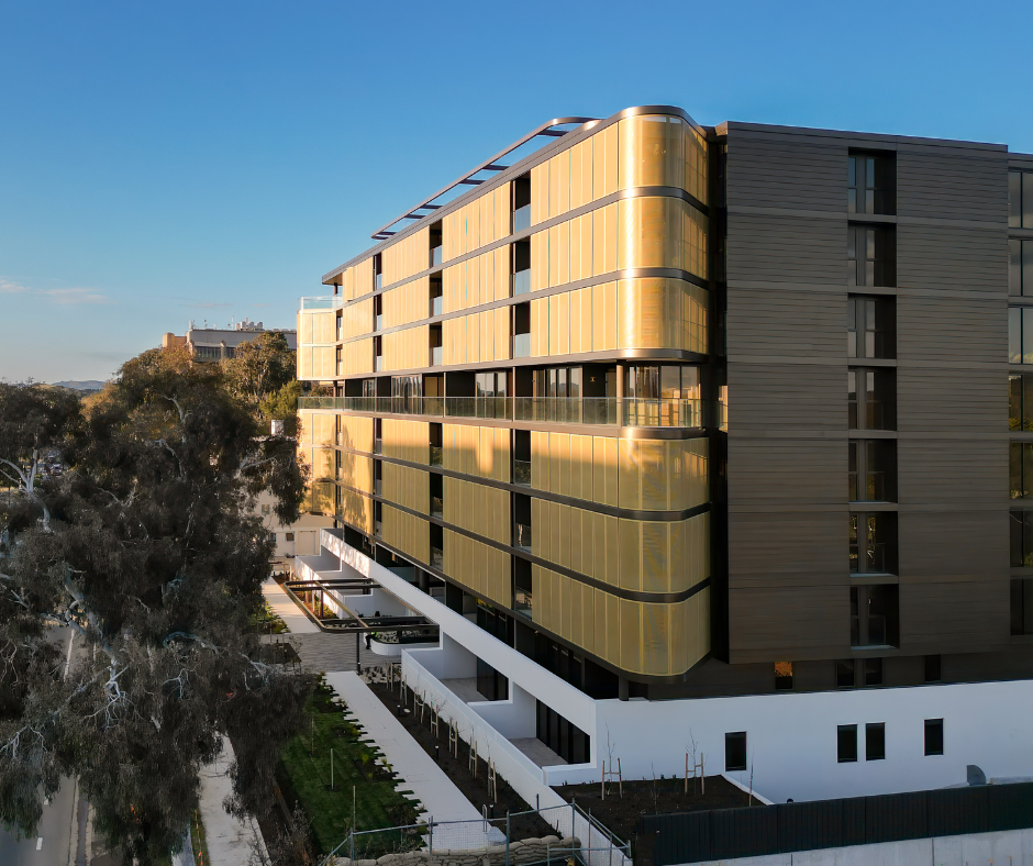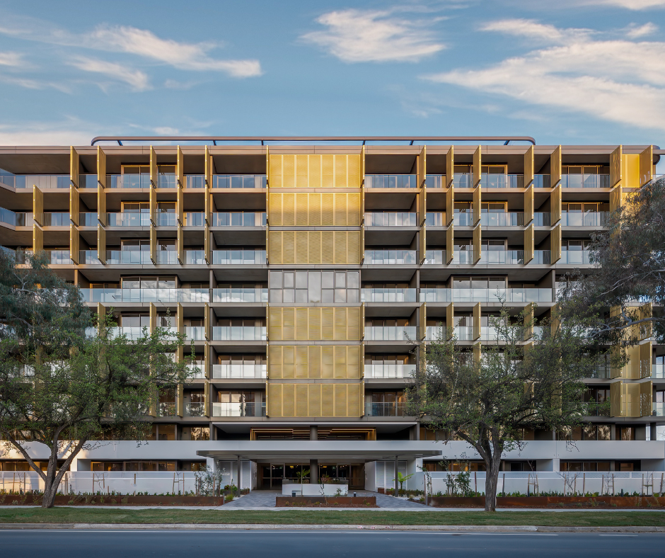 Core Building Group’s stunning architectural masterpiece, Kashmir Apartments, stands tall and proud on Northbourne Avenue in Dickson. A beacon of modern urban living, it is unmissable with its striking metallic gold and bronze operable façade conceived by Stewart Architecture.