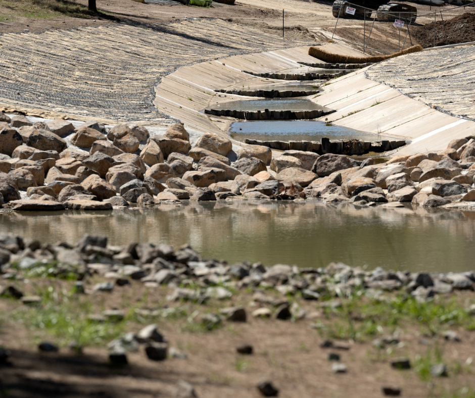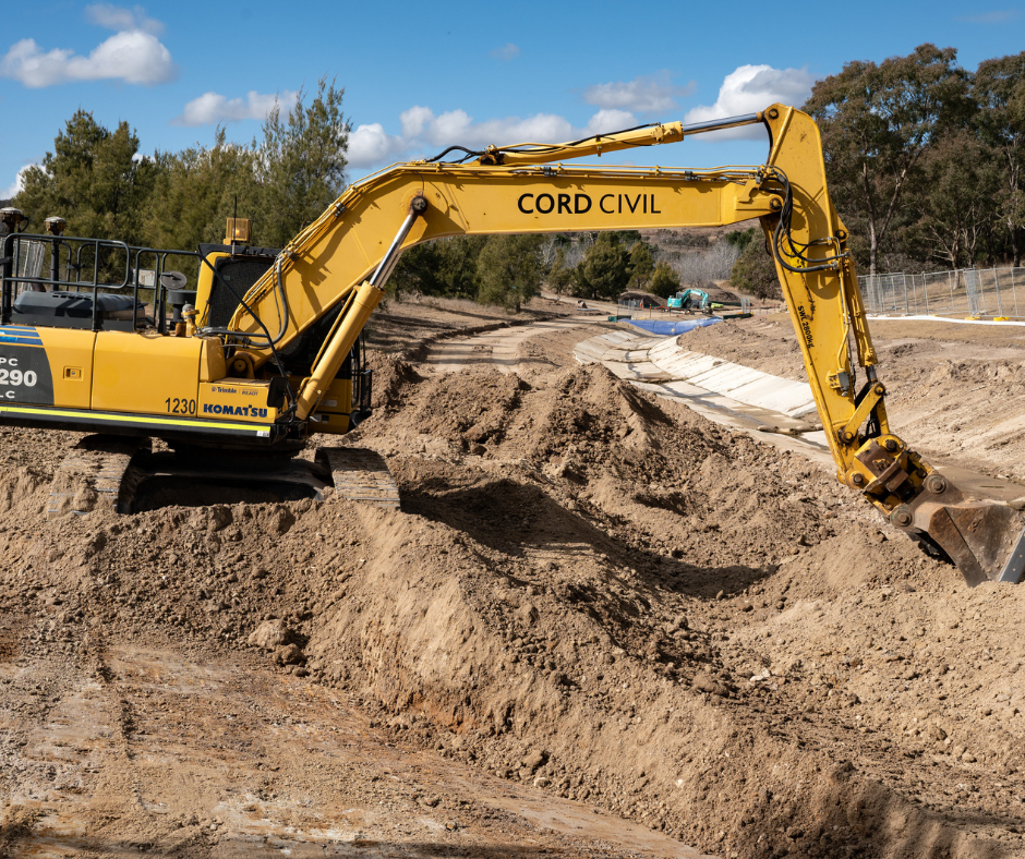 The team oversaw every aspect of the planning, design review, procurement, construction, and close-out phases of the project as part of the broader ACT Healthy Waterways initiative. This project was designed to filter and purify the water as it flowed through Tuggeranong Creek. A significant technical challenge was safeguarding the works and managing stormwater throughout the site. To address this, Cord Civil installed an Aqua Barrier—a large plastic bladder equipped with internal anti-roll baffles, filled with water, serving as a temporary dam.