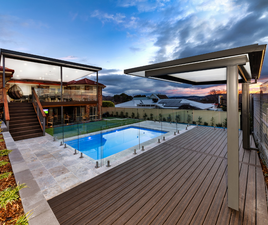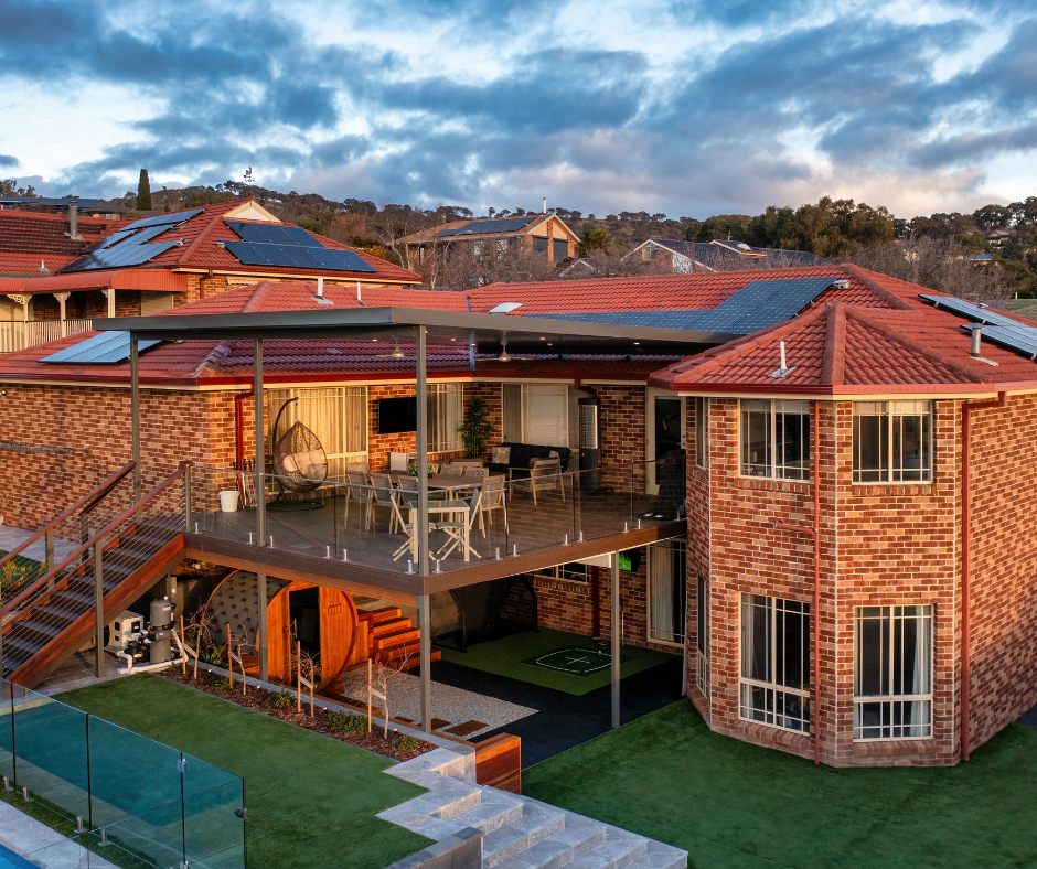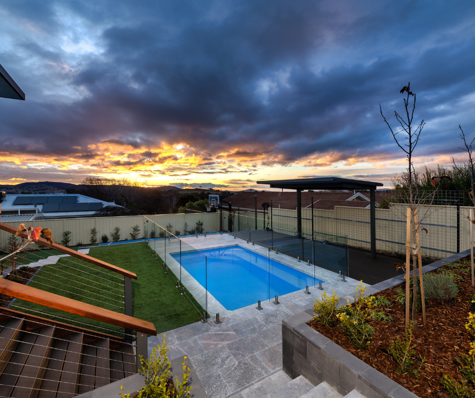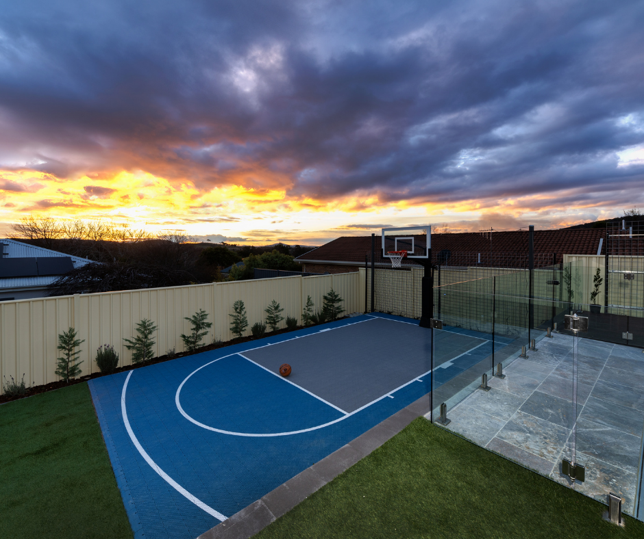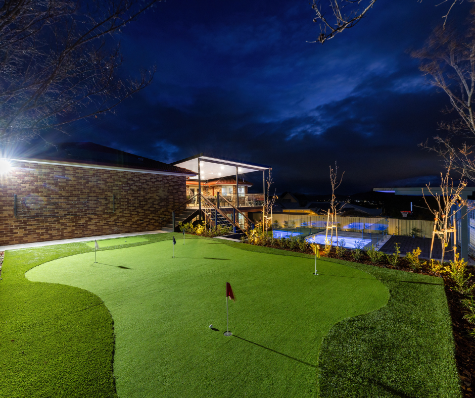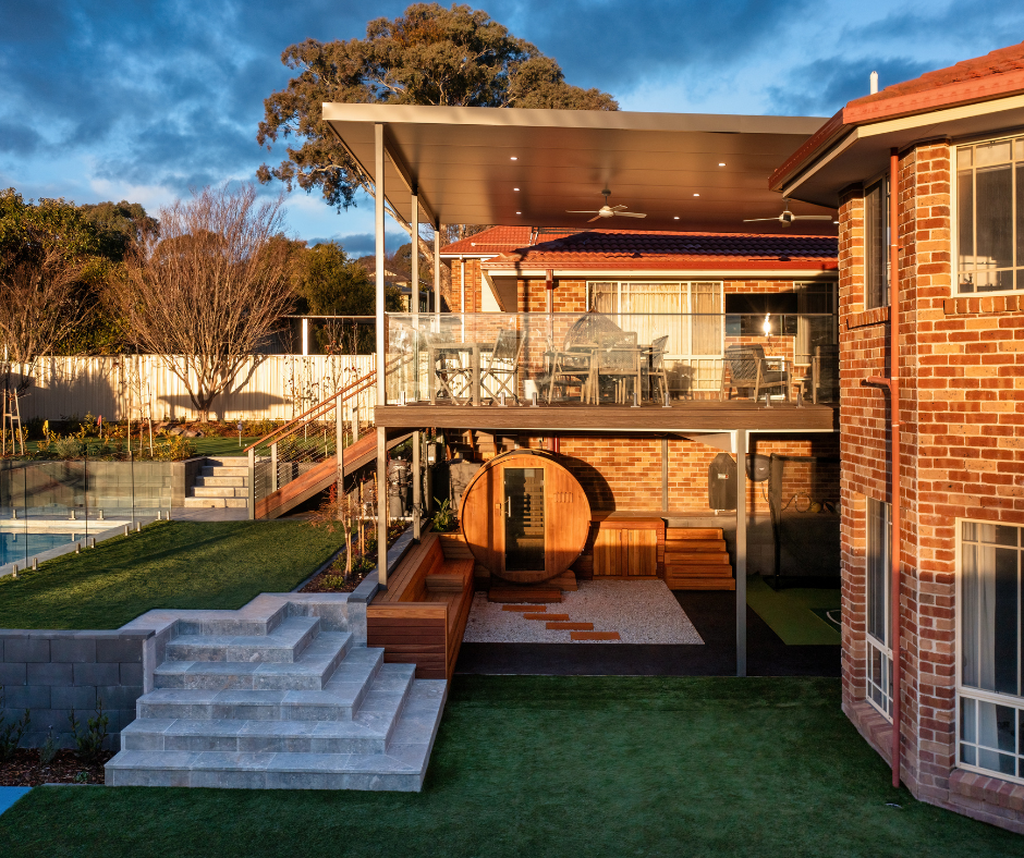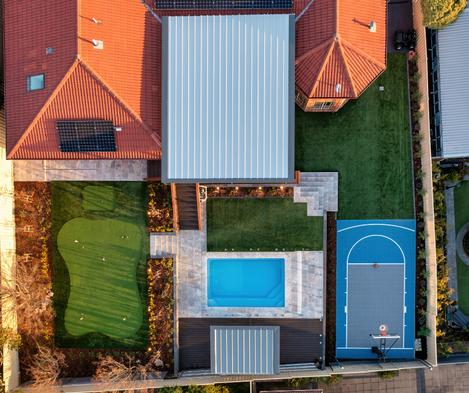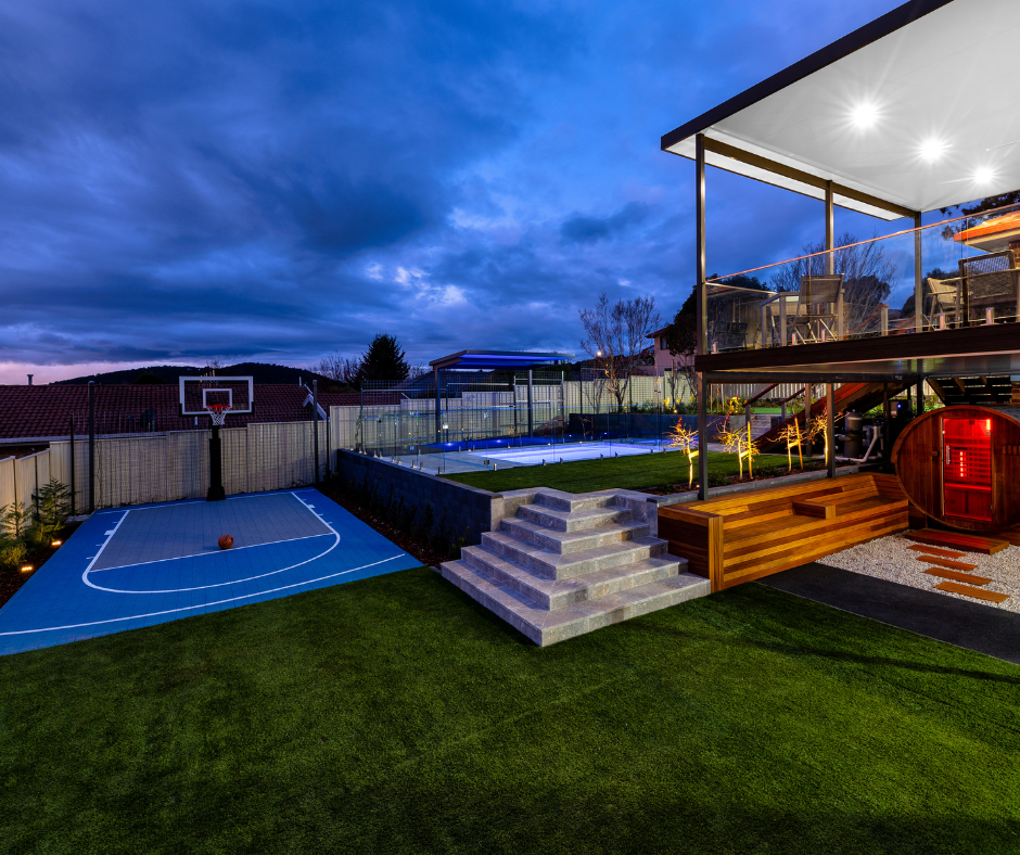 ACT Landscape Construction and ACT Decks have created a stunning outdoor retreat that combines entertainment, recreation, and relaxation across three levels. This incredible landscape design really has it all: the Trex deck offers a warm space for gatherings, while a Versiclad pergola provides shade. The middle level features a lush grassed area and a plunge pool, while the highest level features a custom-designed putting green. The lowest level features a Dream Courts basketball court, while a private sauna beneath the deck offers a secluded space for relaxation. The design strikes a perfect balance between function and luxury, making it a true sanctuary of style.