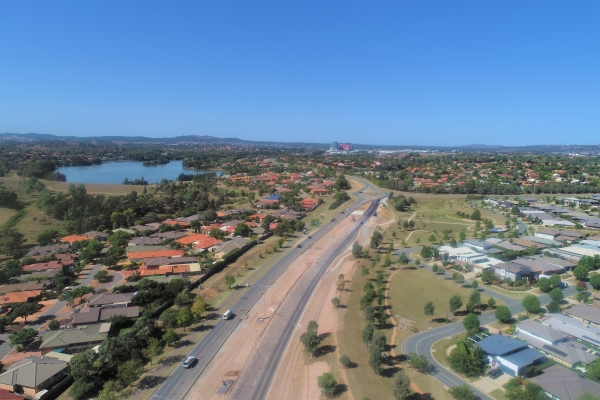 Woden Contractors were required to duplicate Gundaroo Drive between Gungahlin Drive Intersection and the Barton Highway. This involved working in an area where 23,000 vehicles pass through each day. The bulk of the pavement works for the widening of the existing carriageway were undertaken using a simple stop or slow traffic control method. This allowed the works to be completed ahead of time, in turn Woden Contractors were able to take advantage of existing road closures to begin work on the next element of the project, the bridgeworks, improving the safety for construction workers and the public. By using simple and effective methods to progress the works of this project, safety on the project was significantly improved.